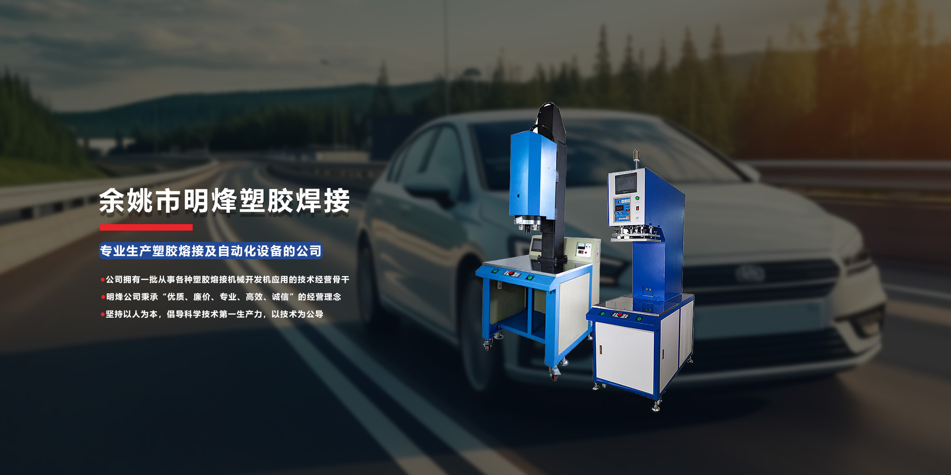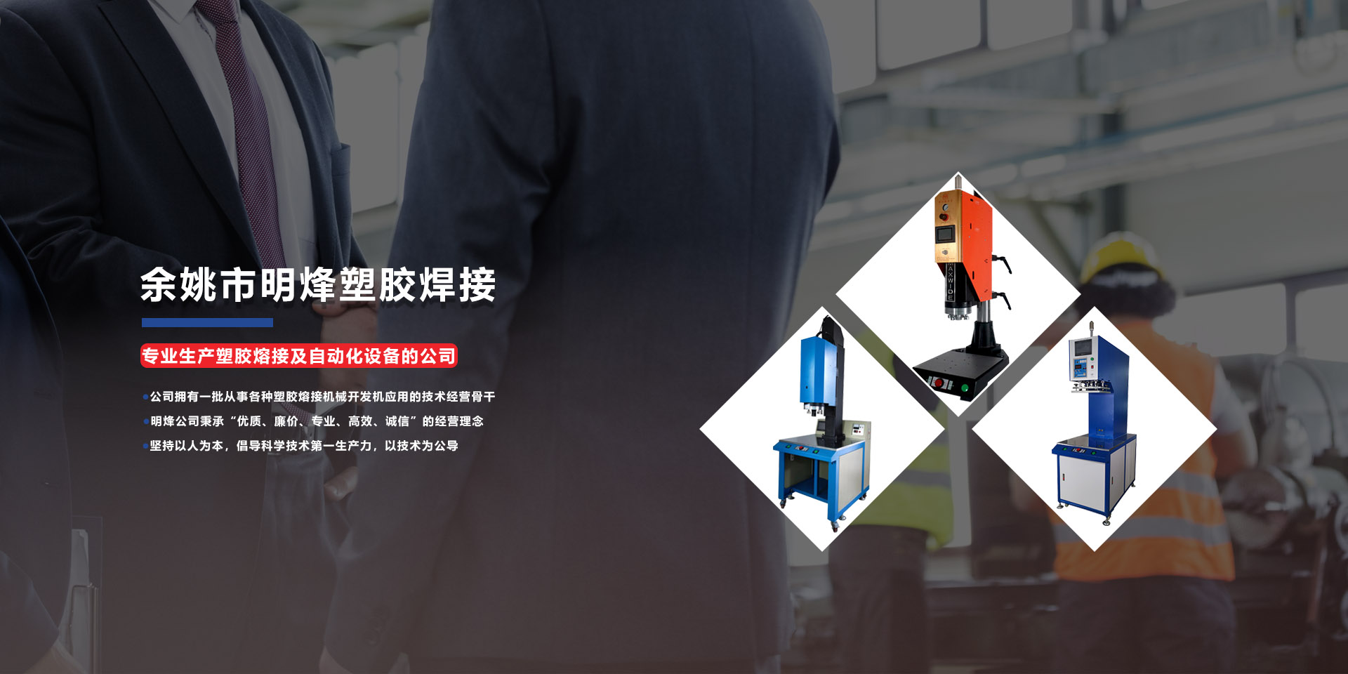 明烽公司主要經(jīng)營(yíng)塑膠熔接機(jī)械及其配套模具,有超音波熔接機(jī)、熱熔機(jī)、(定位)旋熔機(jī)、高周波機(jī),清洗機(jī)以及各種專(zhuān)用非標(biāo)機(jī)械、自動(dòng)化設(shè)備、模具等。